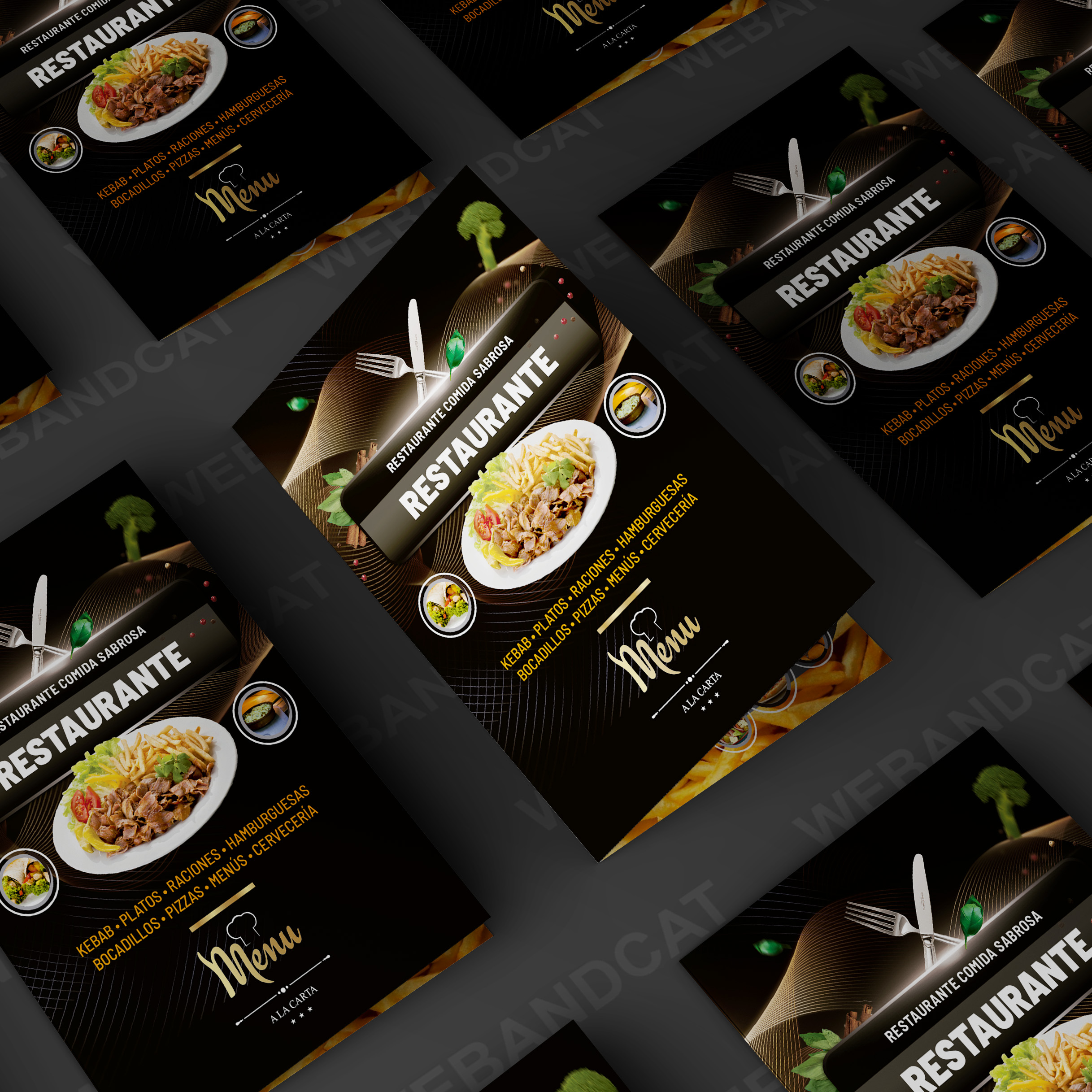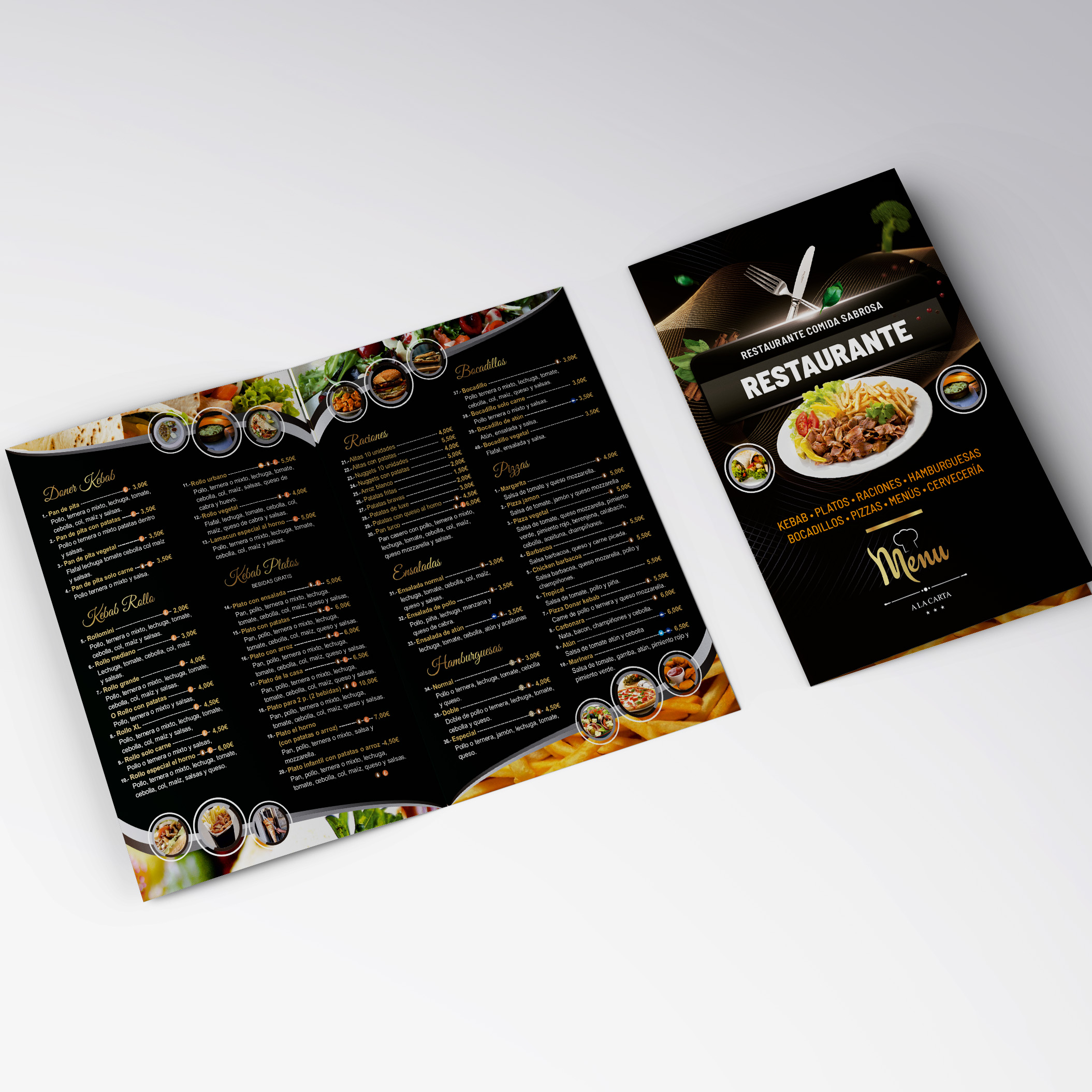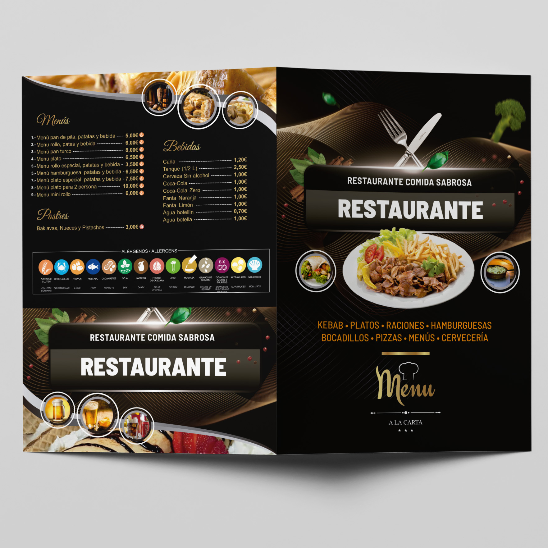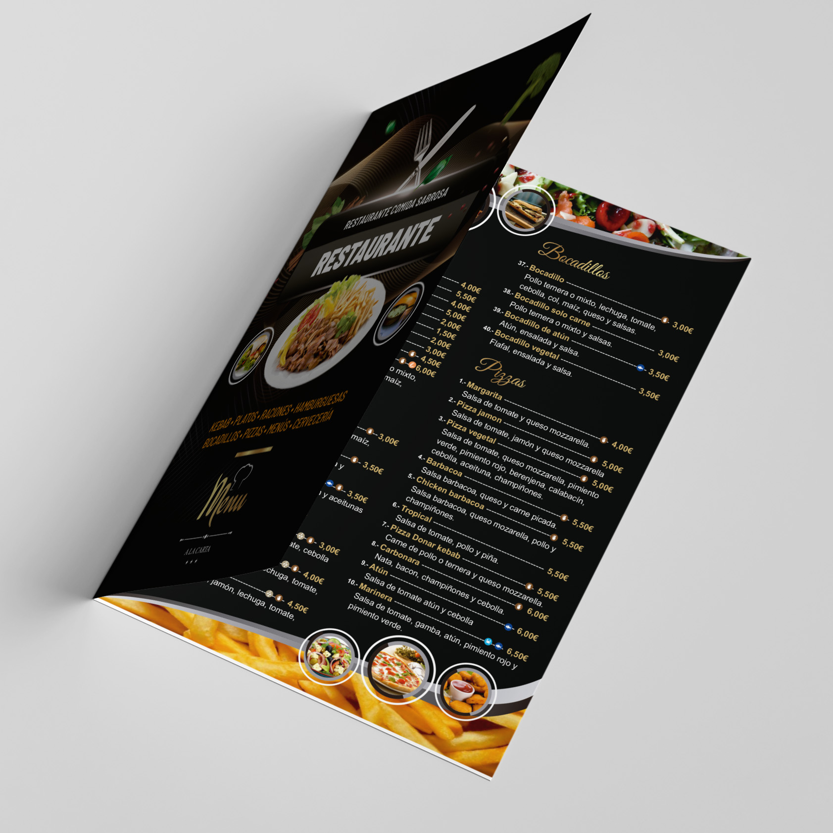 Cartas para Restaurantes tamaño A3 (42×29,7 Cm) con 4 caras impresas a todo color en cartulina de 300g. brillo o mate a elegir, laminadas brillo o mate a elegir y acabado plegadas en díptico